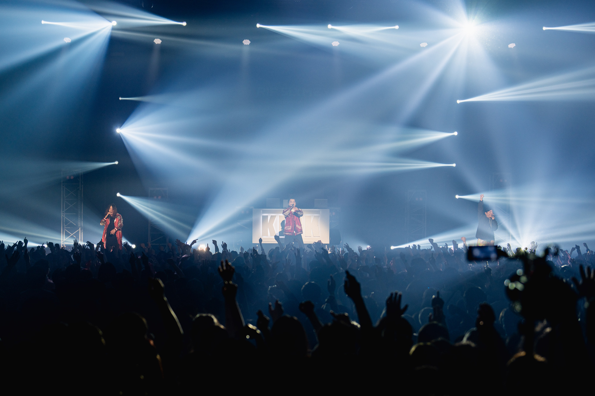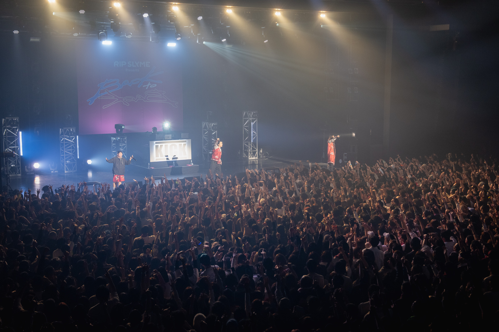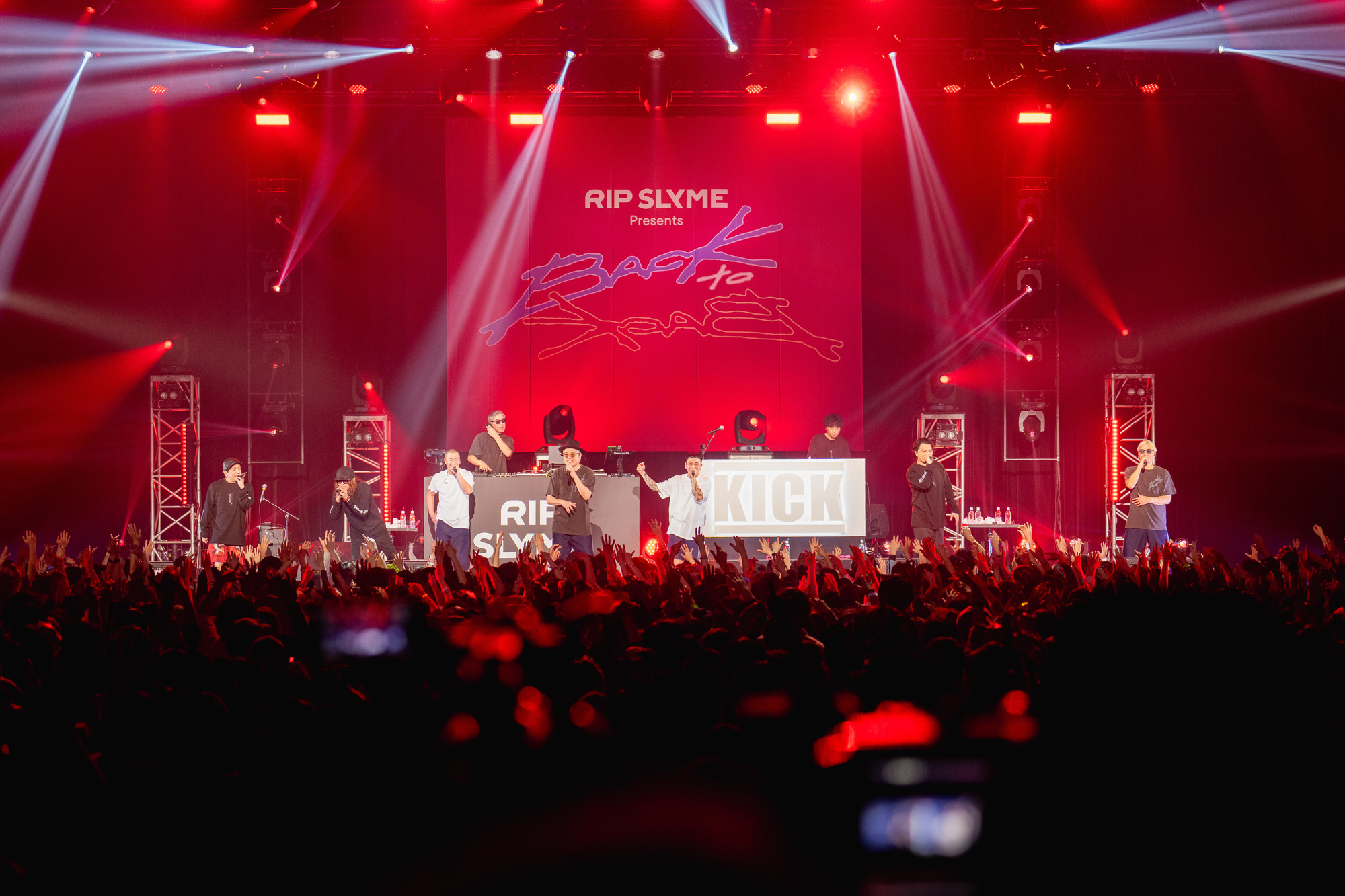 初日を飾ったのは、RIP SLYMEと2カ月違いで2001年にメジャーデビューし、日本のヒップホップをメインストリームへ押し上げた盟友、KICK THE CAN CREW。共にFUNKY GRAMMER UNITに所属し、「同じ釜の飯を食ってきた」(RYO-Z)両者だが、実は対バンは初めてだ。超満員の豊洲PITに1曲目「千%」のイントロが鳴り響いた瞬間から大歓声が沸き起こり、続く「スーパーオリジナル」でフロアの熱は一段と加速する。