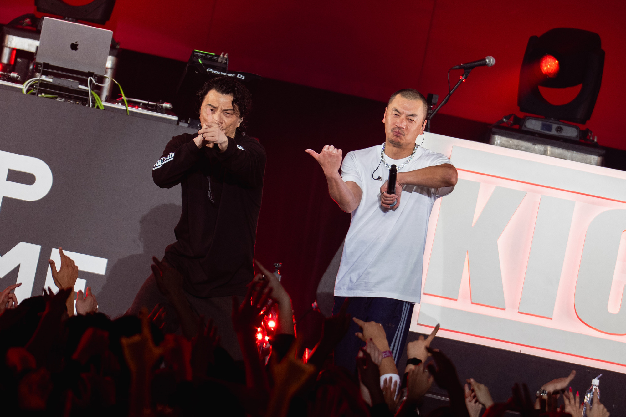 MCでは「対バン相手がKICKとDragon Ashと俺ら。1組だけファンが紛れ込んでる」と笑いを誘いながらも、「はらぺこあおむし」「阿婆擦れ」「Mirage」と、ヒップホップへの愛憎や自己像を描いた楽曲を並べ、自分たちのスタンスを提示。R-指定は、「RIP SLYMEもDragon Ashも、超アンダーグラウンドな人たちも全部を摂取して全部をアウトプットしているのが俺。その証拠に4年前に同じ場所でBAD HOPと対バンしてる。この振れ幅がヒップホップの面白いところ」と語り、世代や立ち位置を超えて繋がるヒップホップ精神を説いた。同じ4つ打ちでも、ディスコ/ソウル寄りのアナログな質感で身体を揺らすRIP SLYMEに対し、Creepy Nutsはテクノ/ハウス寄りのソリッドなデジタルビートでフロアを扇動。ラストの「のびしろ」まで、Creepy Nuts流のダンスミュージックの強度を見せつけ、観客を圧倒した。
